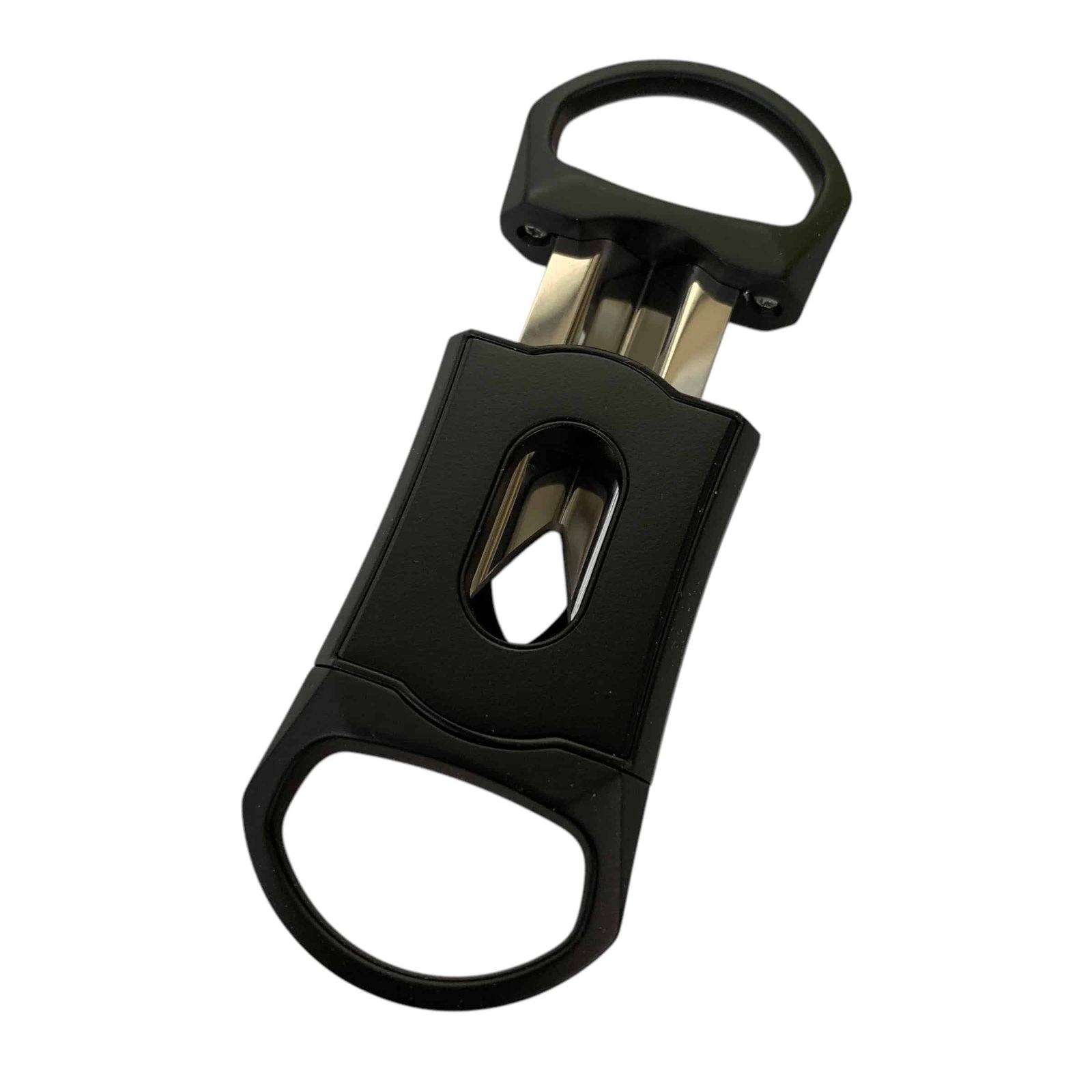 This hefty metal cigar cutter lends a certain weight with its solid steel construction. Featuring a pristine matte black finish and a razor sharp V-Cut style cutting blade, it really is the next step in cigar cutting technology.